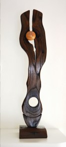Die Mooreiche hat es mir zur Zeit angetan. Wieder habe ich bei den alten Resten ein paar bearbeitungswürdige Stücke gefunden, ich ging daran, diese zu bearbeiten. Ich habe die drei entstandenen Stücke weder mit Titel oder mit einer Interpretation hinterlegt, es darf jedermann oder jedefrau selber grübeln. Für das eine Werk mit den drei Kugeln habe ich nur mögliche Ideen zur Benennung aufgeschrieben, aber es ist ohne Titel geblieben. Könnte ja sein, dass irgendwer eine Superidee hat und diese mir dann mitteilt.