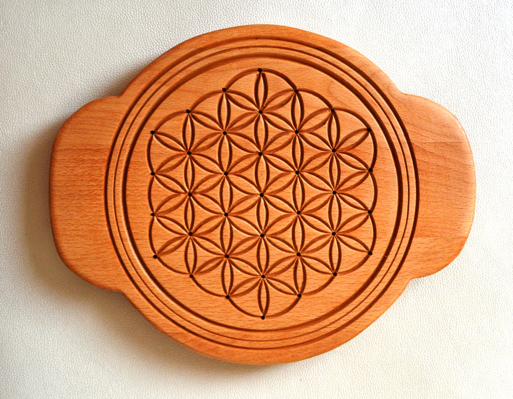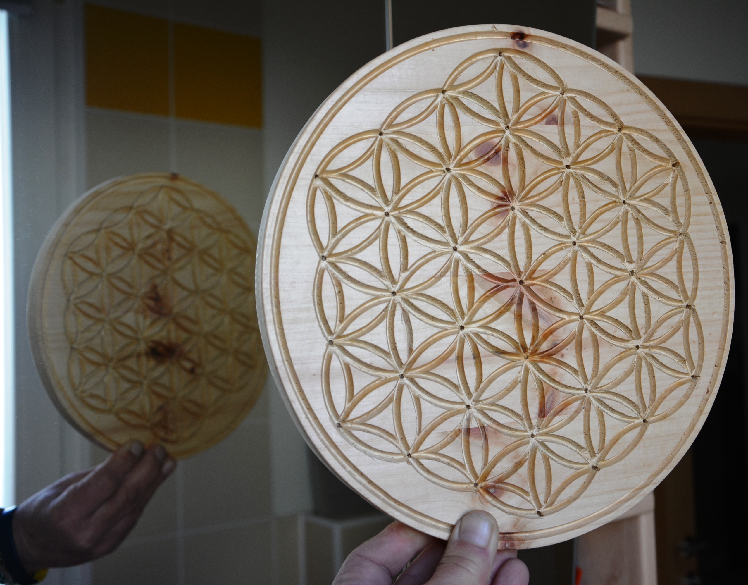 Sofort nach Fertigstellung habe ich einen Holzwechsel auf Zirbe durchgeführt und eine weitere Blume des Lebens gefräst, aber in doppelter Ausführung, Vorder- und Rückseite sind deckungsgleich. Die unterschiedliche Oberflächenstruktur ergibt sich aus den  Asteinschlüssen.
