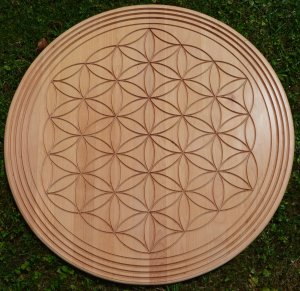 An die Aufgabe: Holz besorgen, leimen, schleifen, zeichnen, bohren, fräsen, schneiden, wachsen, polieren, und da liegt sie nun. Die Glasplatte, die noch die Schutzfunktion für das Holz übernehmen wird, kommt noch, sonst könnten bei Unachtsamkeit die Blume und die Abschlussringe irgendwann einmal dunkelrot werden. Dies kann aber  mit der Zeit auch seinen Charme bekommen. Allmählich kommen die Dinge und alle Wesen in die Jahre und haben dann hoffentlich einen besonderen Reiz.