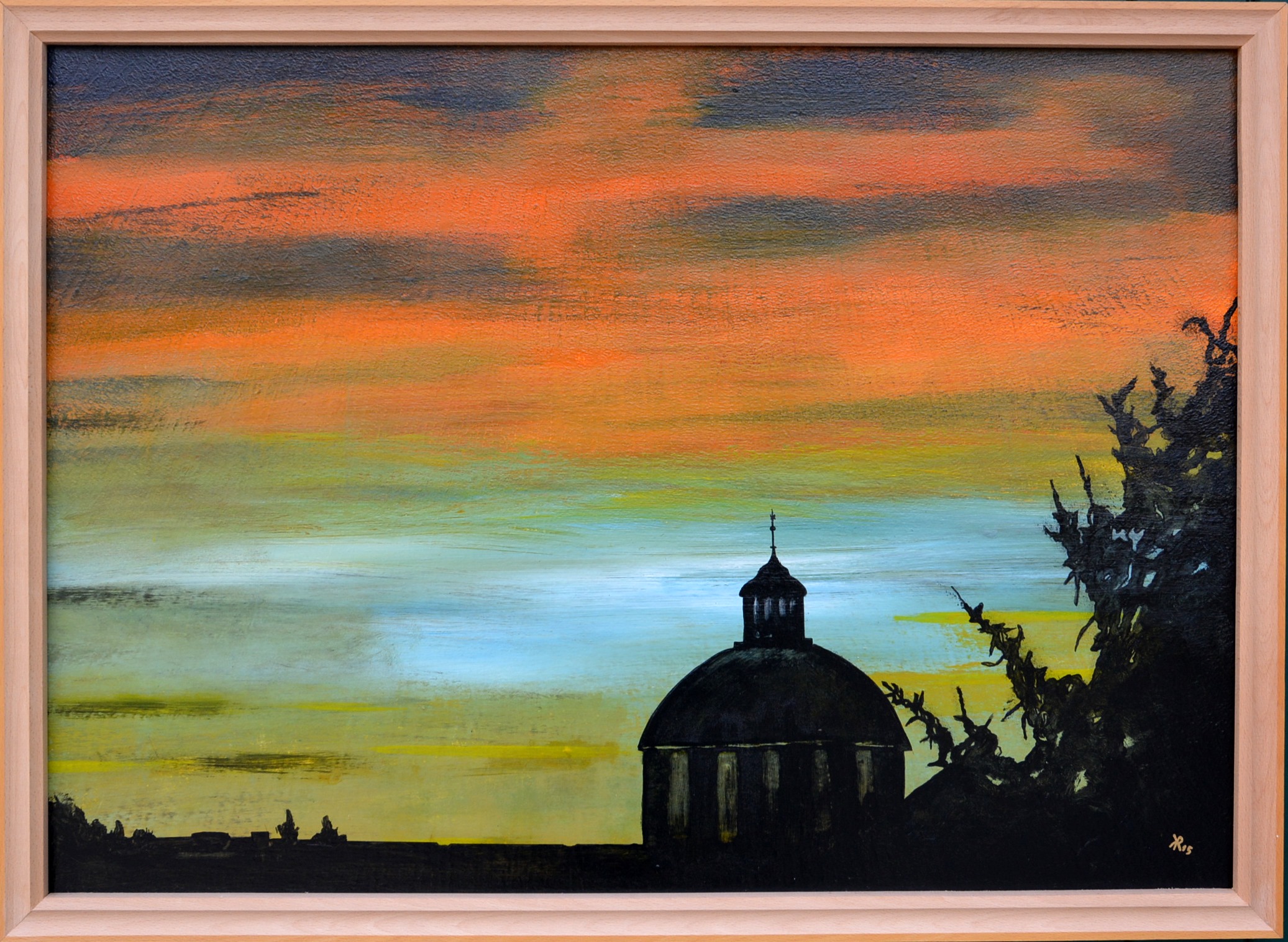 Ich leide nicht unter seniler Bettflucht, aber an diesem Tag hat mich die Sonne aus dem Bett geholt. Ich staunte, machte ein Foto – gleich aus meinem Zimmer – und habe nun, für mich eher außergewöhnlich, was Abbildendes gemalt. Diesen Augenblick wollte ich nicht einfach nur fotografisch festhalten, sondern auch malerisch umsetzen: Unsere große Pöllauer Kirche mit der Riesenkuppel gibt einfach was her.