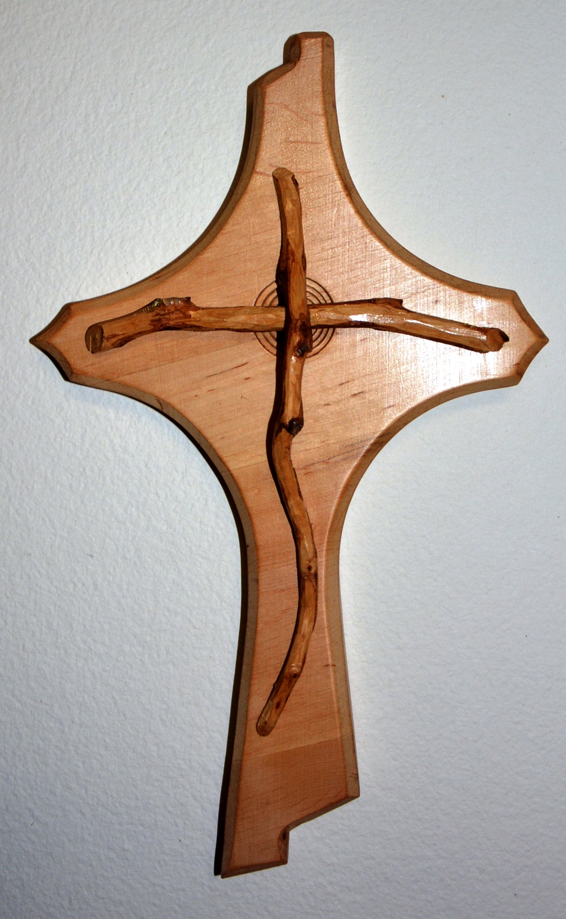 Größe: Beide Kreuze ca. 30×20, aus einem Stück, Erlenholz, mittig Stufenbohrung