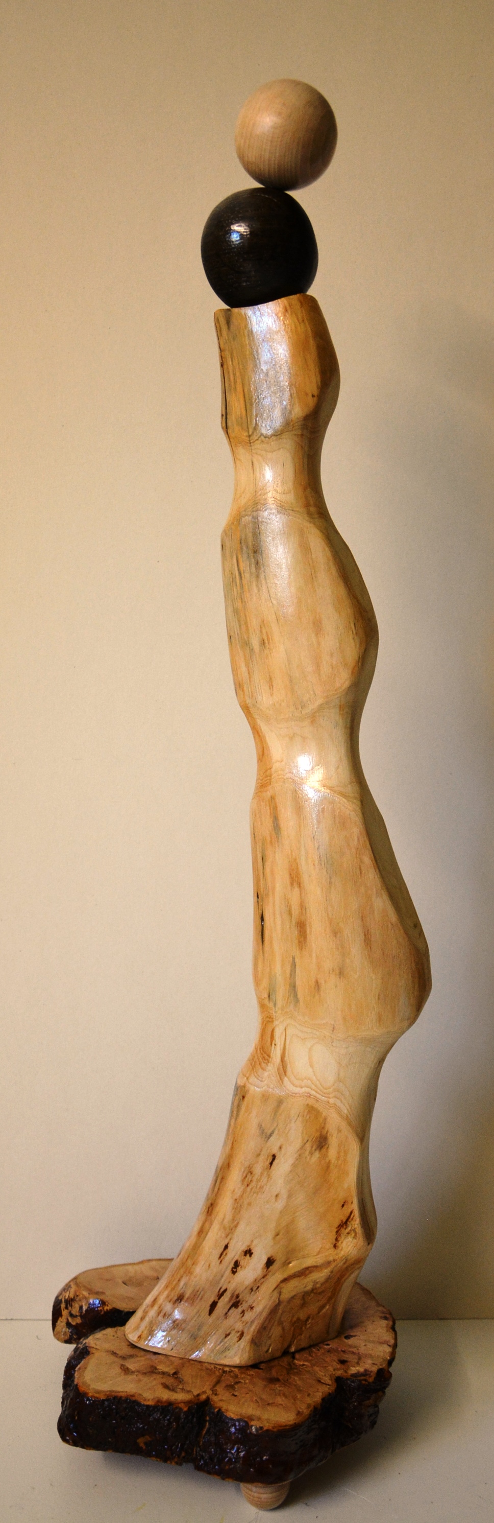 Ein weiteres Stück fiel mir bei dieser Suche auch noch in die Hände. Es ist nur ein Stück Holz, aber mit kleinen Bearbeitungen, Reinigung, leichten Formveränderungen, Erweiterung mit Sockel und oben aufgesetztem Abschluss lassen den Gedanken schon wieder freien Lauf. Es muss nicht gefallen, doch mir hat es Freude bereitet. Der Sockel ist aus einer Apfelbaumwurzel, die aufgesetzten Kugeln sind aus Mooreiche und Fichte, der Mittelteil ist das nicht definierbare Schwemmholz. Kaum zu glauben, aber das Schwemmholz ist staubtrocken.