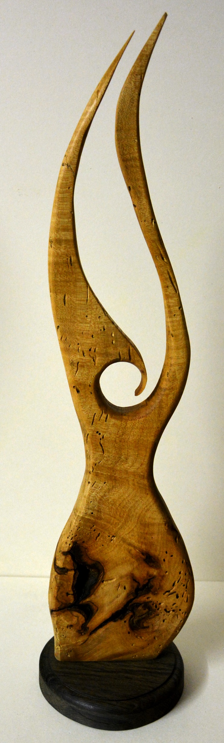 Die beiden Skulpturen wurden aus Ahorn mit Asteinschlüssen und jeweils mit einem Sockel aus Mooreiche versehen – sollte nicht weiter wundern.