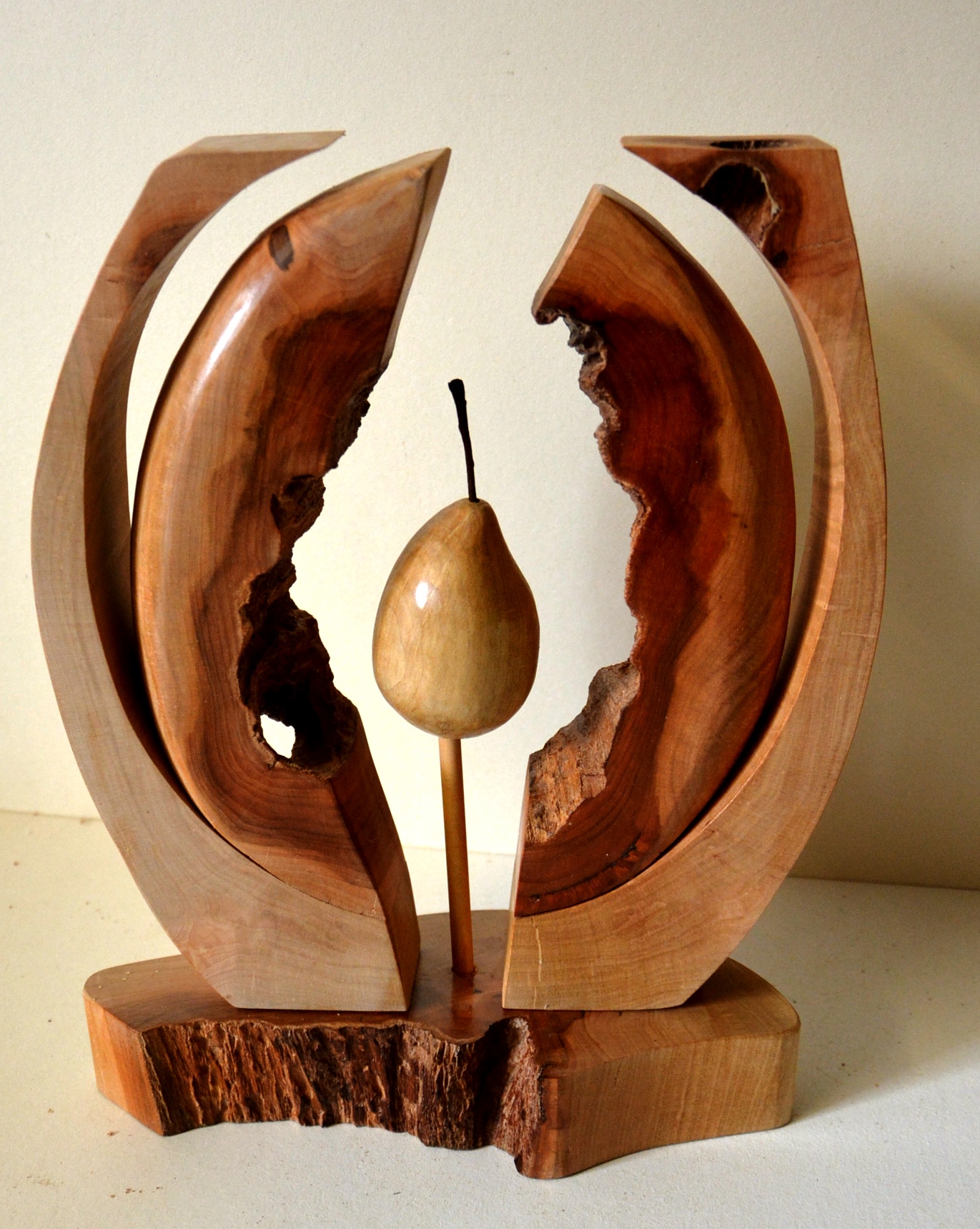 So habe ich mich wieder einmal dem tollen Holz der Herbstbirne gewidmet und die unten dargestellte Skulptur ist entstanden, die für mich eine fast monstranzähnliche Form aufweist, wobei der Hinweis auf die Form die Vielfältigkeit dieses weltlichen Leitproduktes zeigen soll.