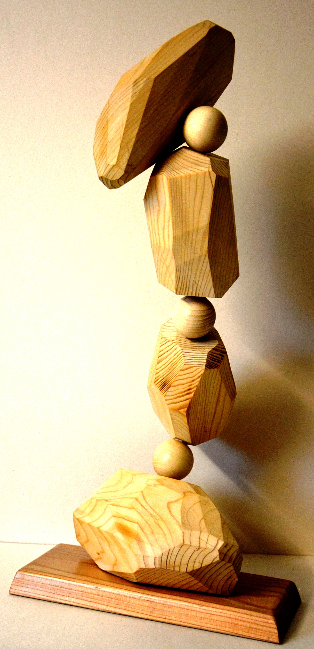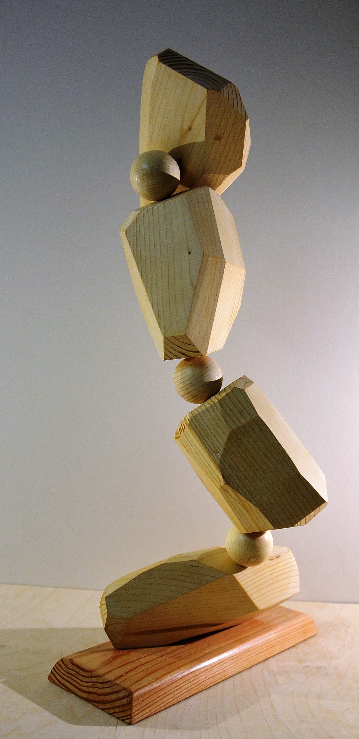 Mit dieser nachweislich ca. 280 Jahre alten Kiefer habe ich schon einige Stücke, wie Vasen, hergestellt. Das Holz habe ich, wie bereits einmal beschrieben, von einem Dachstuhl eines in Graz teilabgerissenen Betriebsgebäudes. Gott sei Dank gibt es den Betrieb weiterhin, es ist nämlich eine Brauerei. Nun habe ich die restlichen Holzteile kantig ausgeführt, diese mit einfachen Holzkugeln verbunden und „Riesendiamanten“ in Kiefer dargestellt. Nicht wirklich aufregend, aber ich wollte die übrig gebliebenen Holzstücke einfach gut verwerten und auf bestehende Gesetze der Schwerkraft keine Rücksicht nehmen.