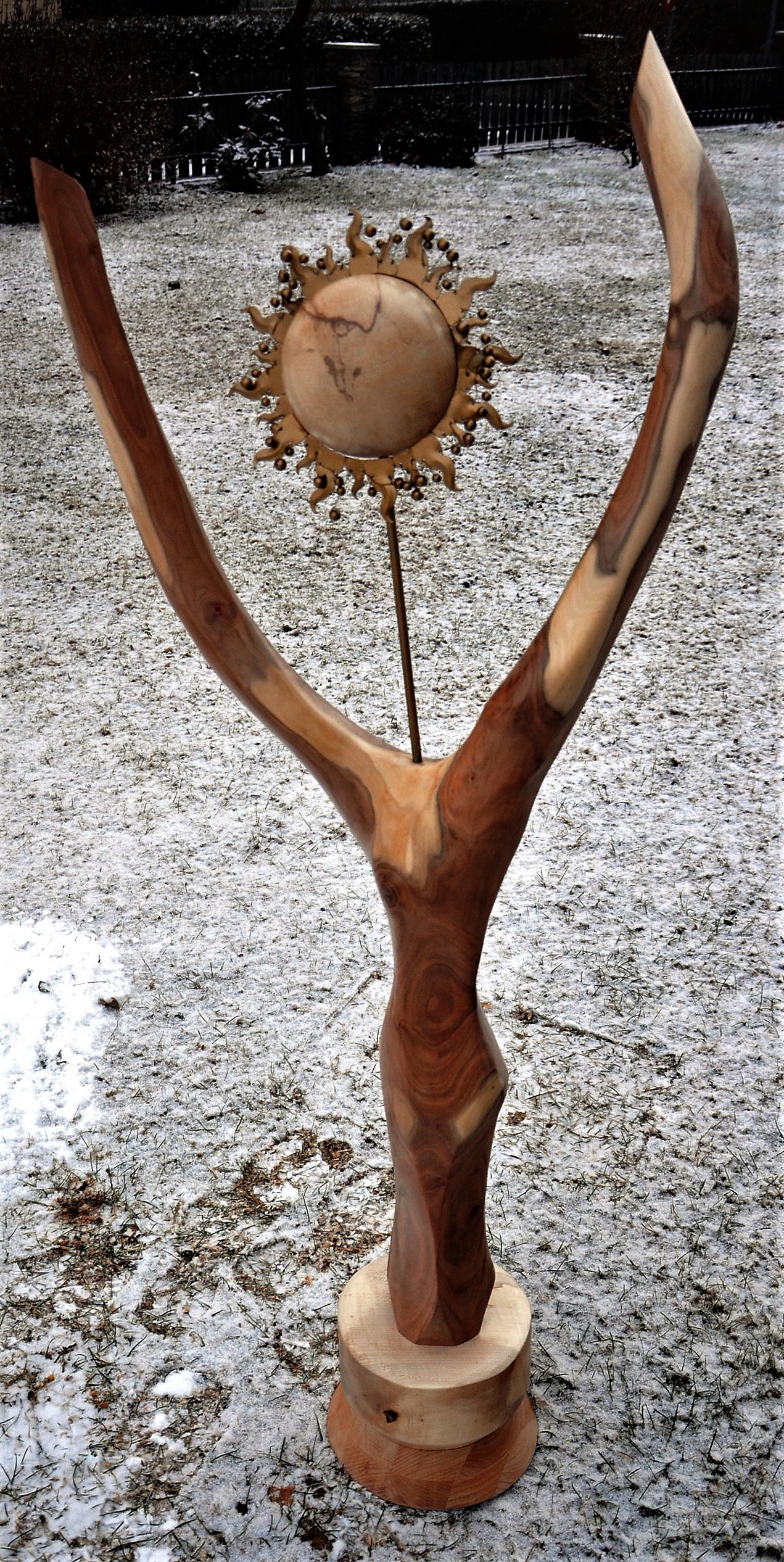 Ich lasse das Hobbyarbeitsjahr mit einer Sonnenskulptur aus Zwetschke, Ahorn und Buche ausklingen. Diesmal ist das Objekt ein wenig größer ausgefallen, weil ich das Grundmaterial der Zwetschkenäste nicht erheblich verkleinern wollte. Dafür musste der Sockel ( Ahorn, Buche) auf Grund der erforderlichen Stabilität massiver und schwerer werden. Die Sonne ist eine Vollholz – Ahornkugel , der Protuberanzenkranz ist aus Metall.