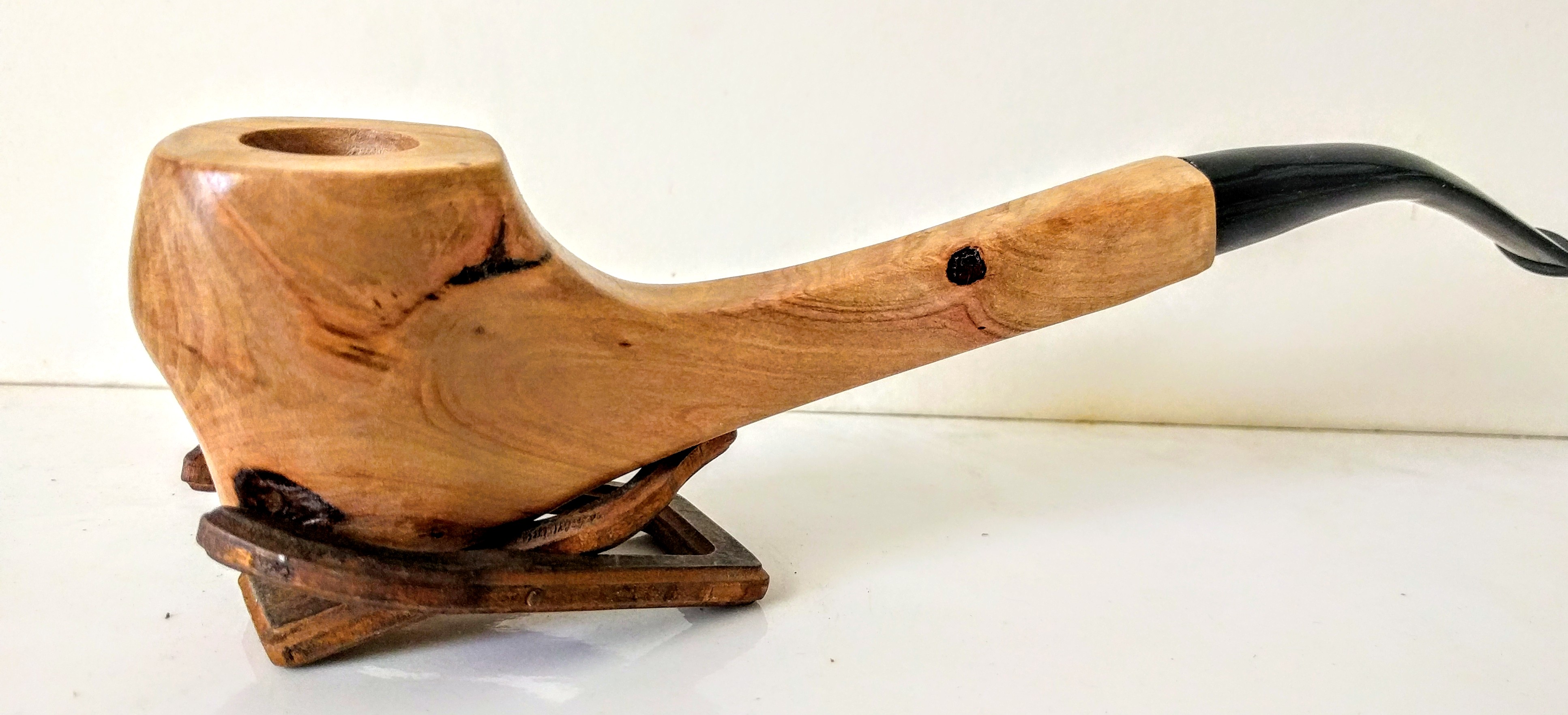 Ohne den Versuch zu starten, eine Pfeife aus Hirschbirne zu fertigen, kann ich diese Kleinserie ja nicht beenden. So habe ich für diese Pfeife eine Sonderform gewählt und die Holzeinschlüsse wurden absichtlich in Kauf genommen – ist ja bei Tabakpfeifen sonst ungewöhnlich.