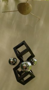 Mutet utopisch an,  war aber  in der Herstellung eine echte Freude. Die drei Metallkugeln drehen sich in den Rundungen der beiden über die Ecken rund verbundenen offenen Würfel. Das Ganze hängt an einer Halbkugel mit drei Verstrebungen für die Aufhängungen der Metallkugeln. Fällt unter echt kurios!