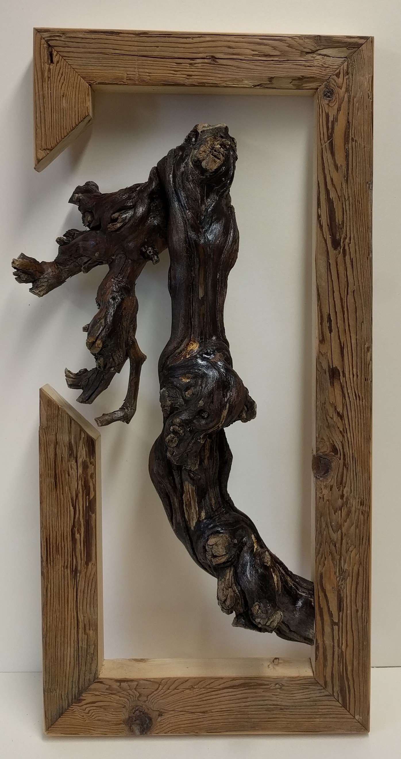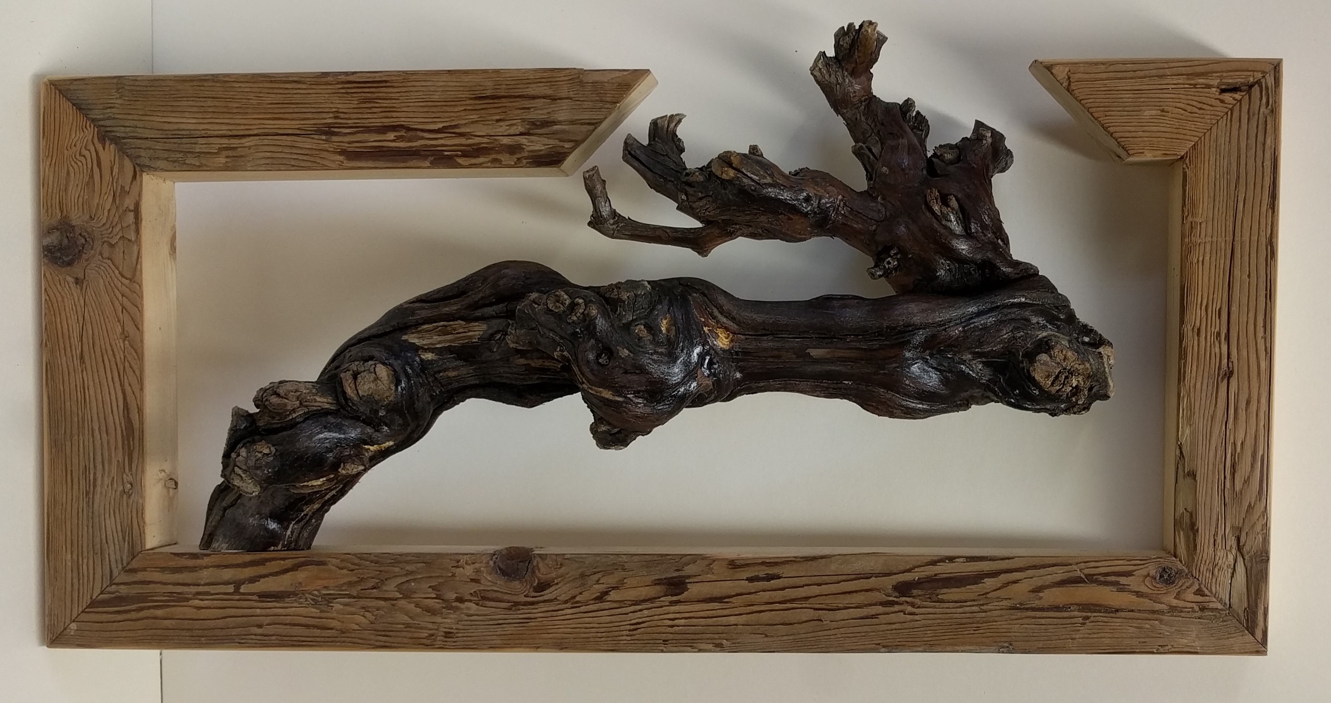 Uralte Chardonnay-Rebe, in einen aus altem Dachstuhlholz gefertigten Rahmen, gesetzt. Die Rebe lässt sehr viel Interpretationsraum.