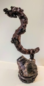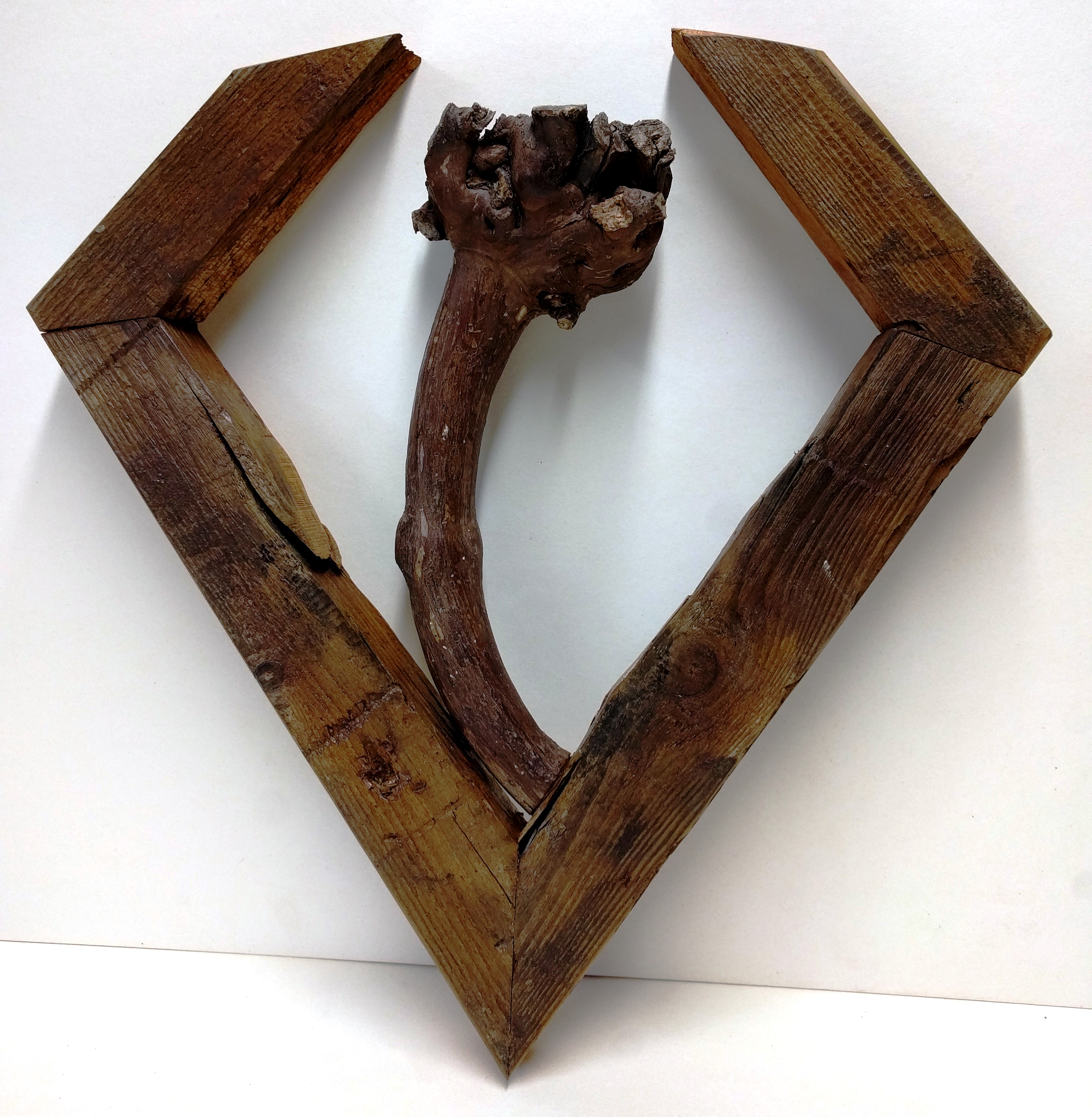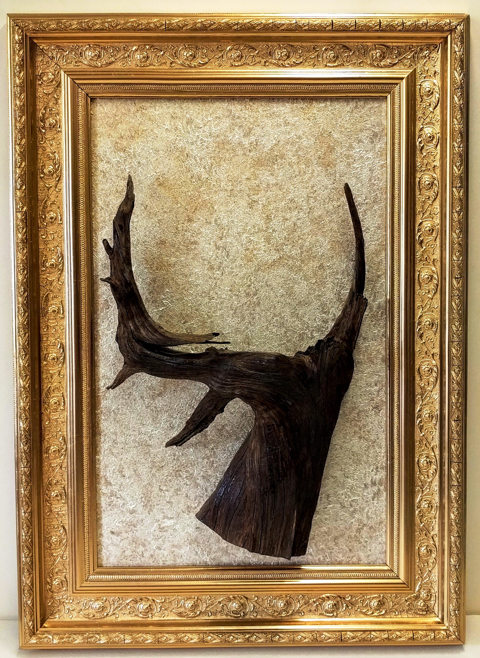 Aus Alt wurde Neu, (Rahmen goldfärbig gemacht, Holzplatte mit Perlmuttfarbe gestaltet), die Lärchenwurzel war ein Fundstück.