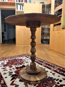 Mein guter Freund Tischlermeister bearbeitet alle Holzsorten, doch alte gekochte Nuss ist auch für ihn etwas Besonderes. So haben wir in Koproduktion einige solcher abgebildeten Tische hergestellt. Manche Betrachter meinten beim ersten Hinschauen, die Tischplatte sei furniert, kleiner Irrtum, der gesamte Tisch ist aus Nussvollholz. Grundplatte, Aufsatz, Tischbein alles gedrechselt, Tischplatte aus einzelnen Dreiecken zusammengestellt, Platte von außen nach innen abgeplattet und der gesamte Tisch ist ohne Aufwand zerlegbar. War eine wunderbare Arbeit und mein Meister und ich haben große Freude daran.