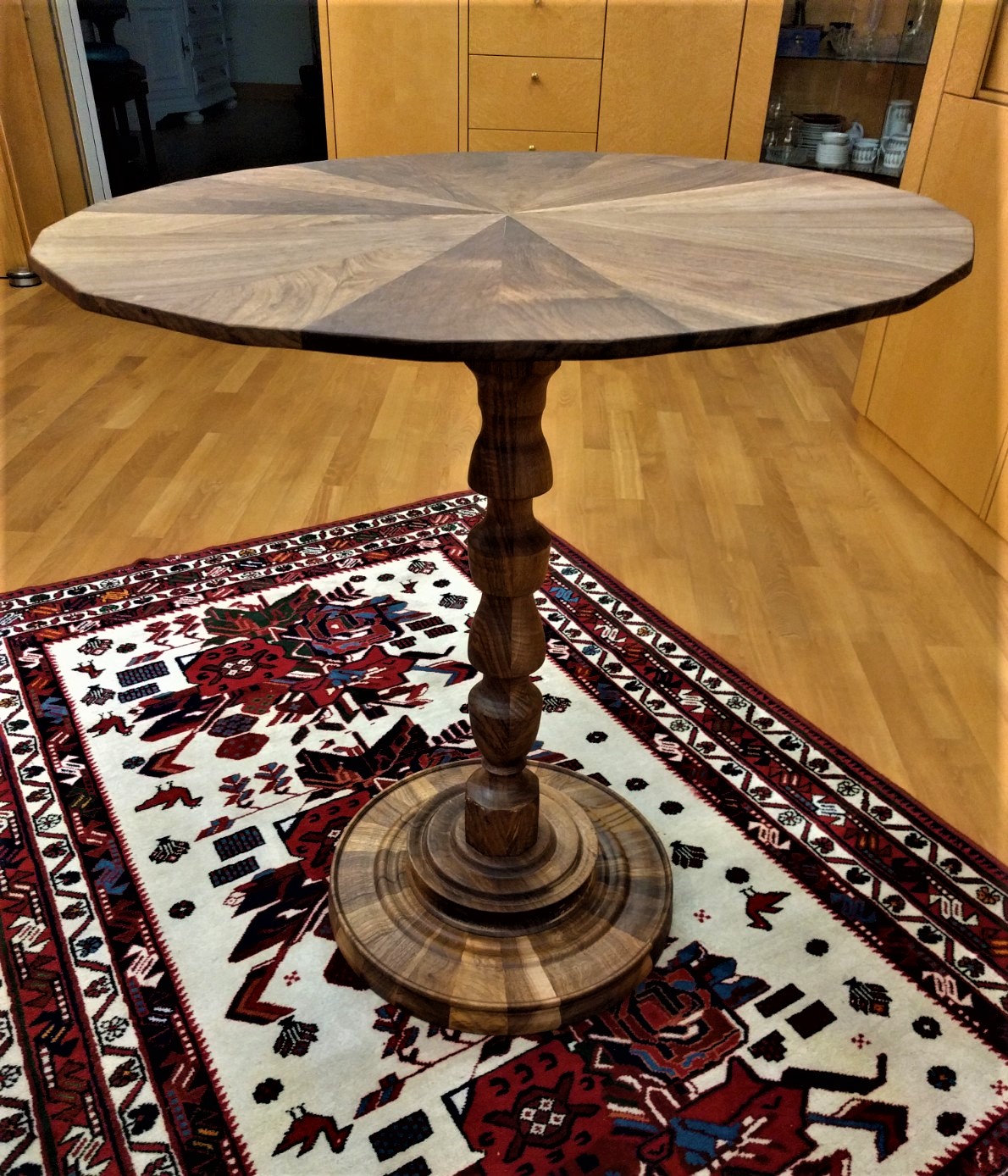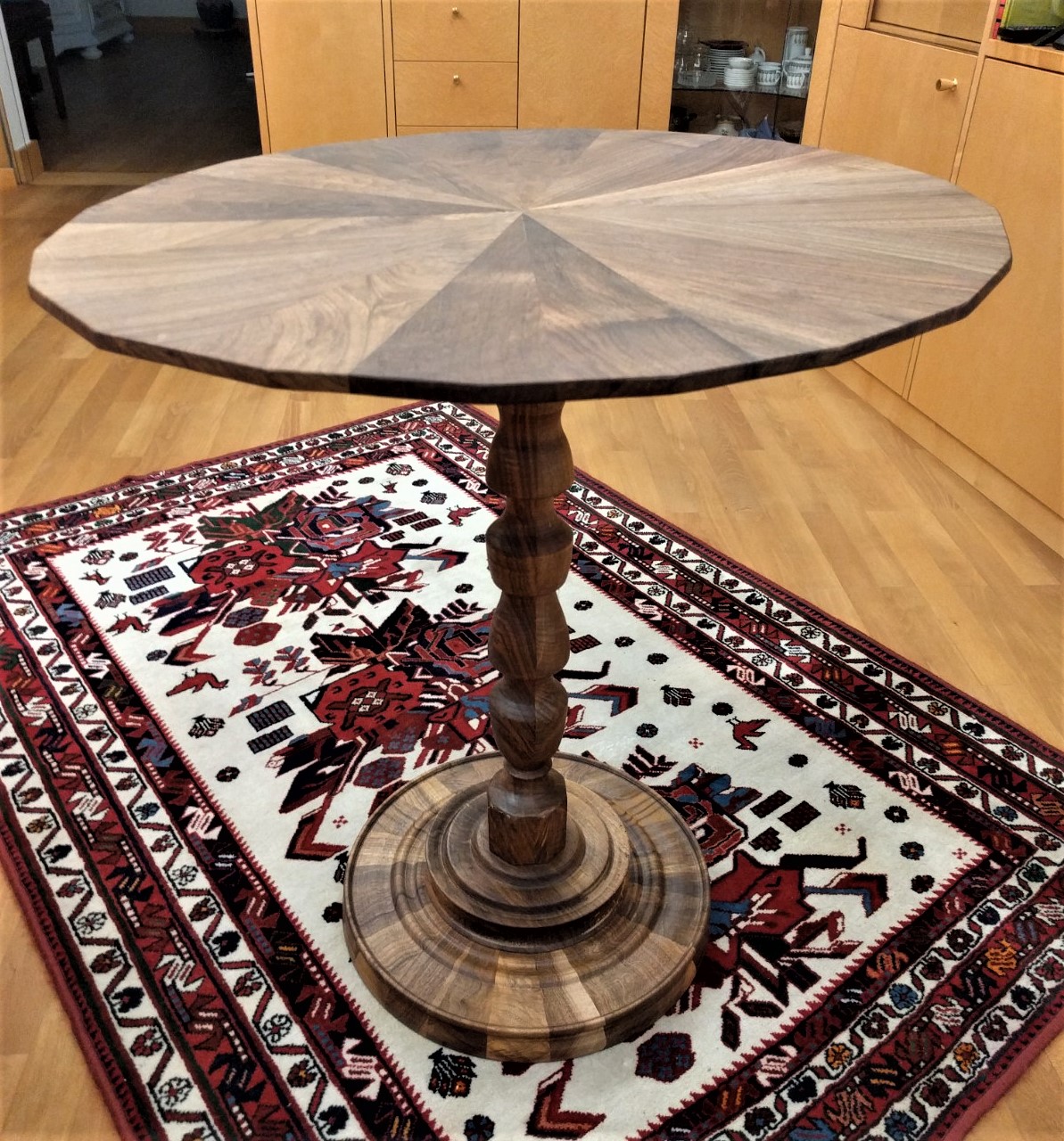 Mein guter Freund Tischlermeister bearbeitet alle Holzsorten, doch alte gekochte Nuss ist auch für ihn etwas Besonderes. So haben wir in Koproduktion einige solcher abgebildeten Tische hergestellt. Manche Betrachter meinten beim ersten Hinschauen, die Tischplatte sei furniert, kleiner Irrtum, der gesamte Tisch ist aus Nussvollholz. Grundplatte, Aufsatz, Tischbein alles gedrechselt, Tischplatte aus einzelnen Dreiecken zusammengestellt, Platte von außen nach innen abgeplattet und der gesamte Tisch ist ohne Aufwand zerlegbar. War eine wunderbare Arbeit und mein Meister und ich haben große Freude daran.