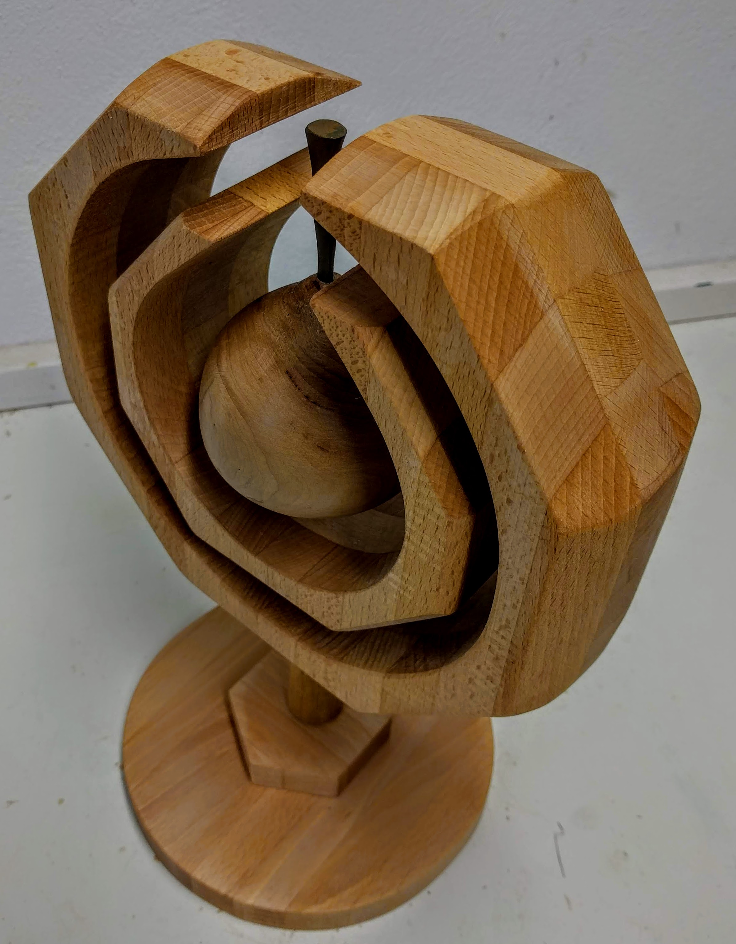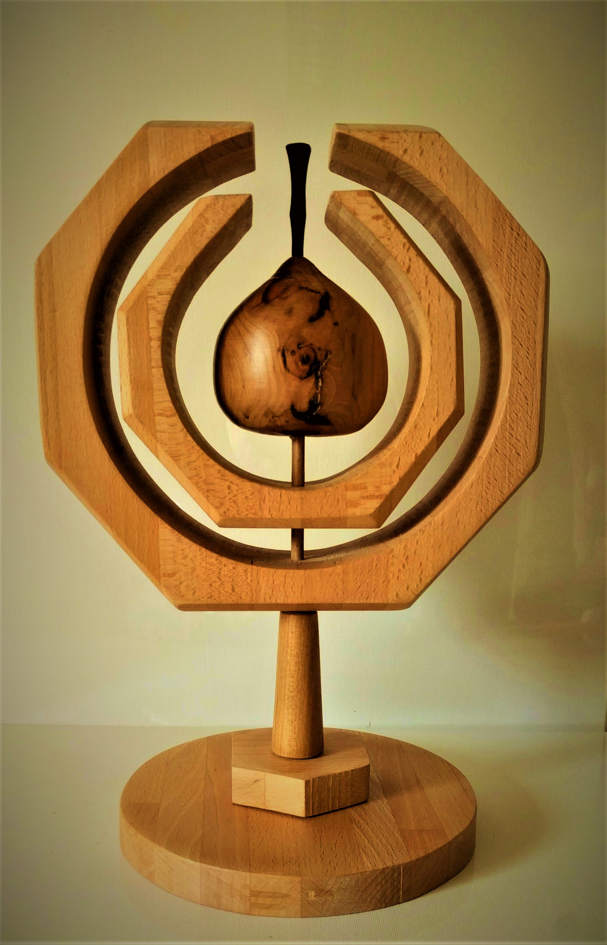 Eine gedrechselte Hirschbirne, eingefasst in Buchenholz. Die Verbundenheit zu unserem Pöllauer Tal und zu unserem Leitprodukt, der Hirschbirne, ist schwer zu leugnen. Das war auch meine Intuition beim Entwurf für dieses Projekt. Die Bearbeitung war etwas aufwendig, aber ich bin mit dem Ergebnis einfach zufrieden. Verwendet habe ich drei kleinere Platten mit stabverleimter Buche, was man in der Seitenansicht gut erkennen kann.