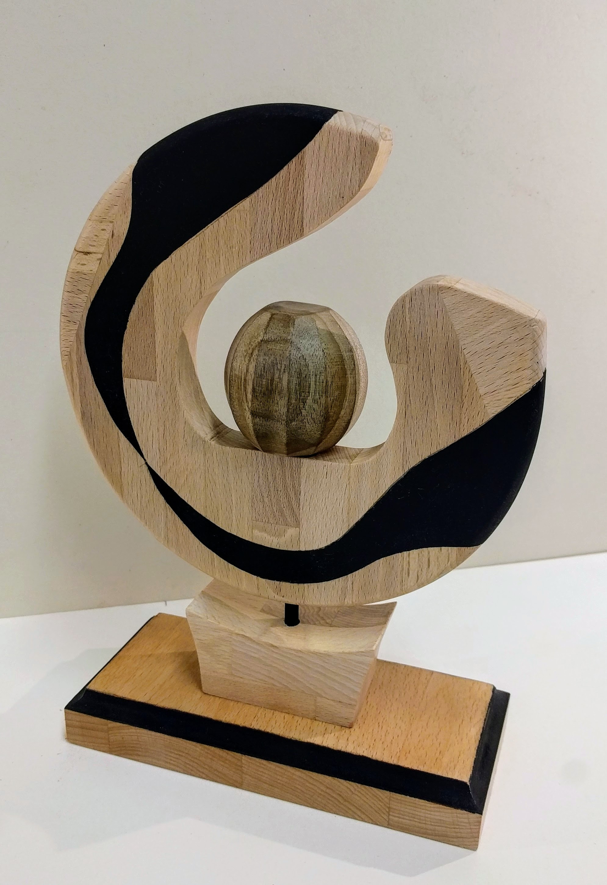 Die Bearbeitung beider Objekte erfolgte ähnlich, nur die Einzelteile sind mehr geworden und im Zentrum wurde eine Kugel aus Nuss mit einer besonderen Oberflächenbearbeitung platziert. Ich habe konkave Längsstreifen eingeschliffen, das fand ich einfach reizvoll.