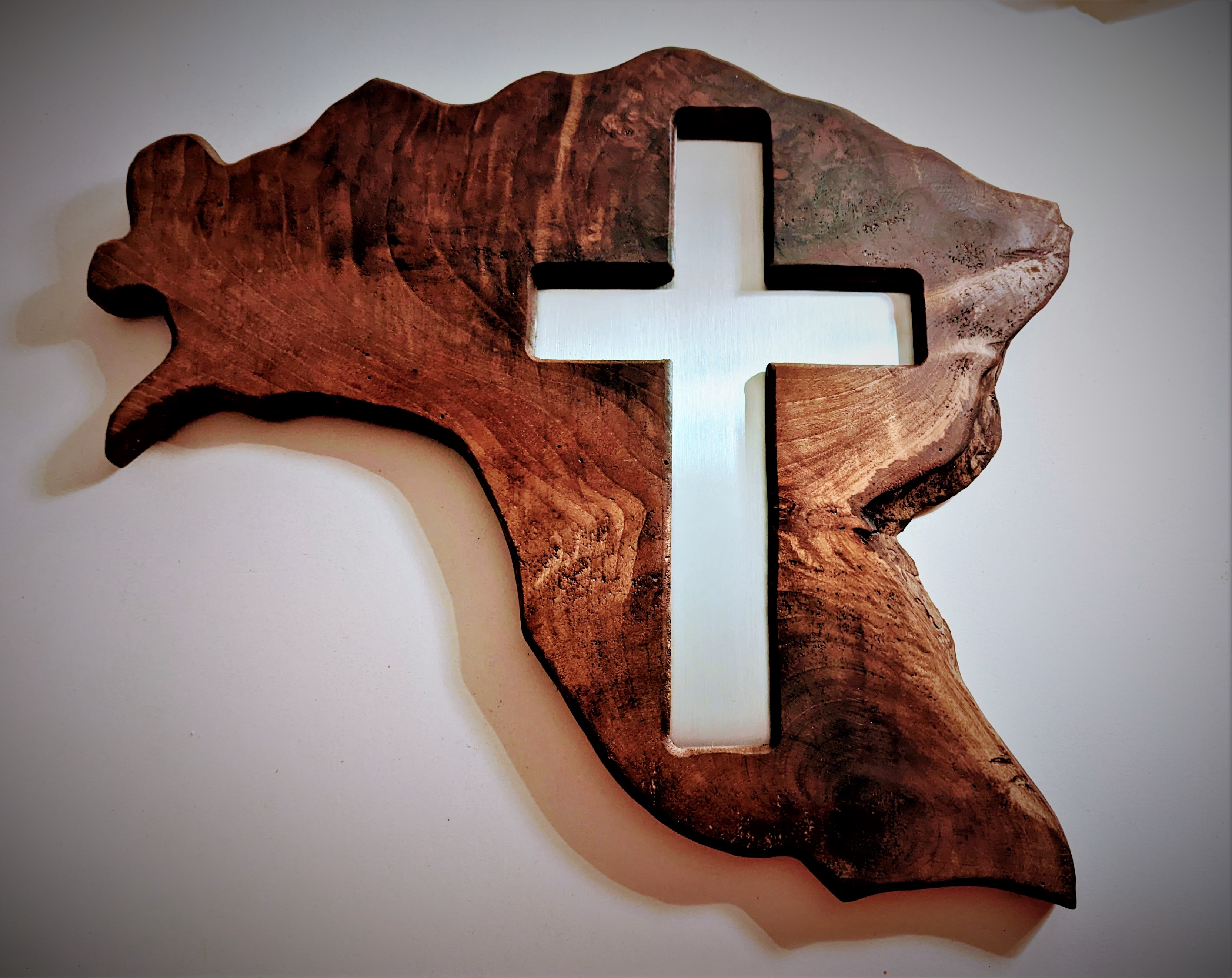 Beim zweiten Werkstück wurde die Rückseite ausgefräst und das Kreuz aus NIRO eingelegt. Die Umrisse des Objektes sollen symbolhaft mein Heimatbundesland darstellen. Es wäre schade gewesen das wunderbare Holzstück weiter zu beschneiden und so ist ein Teil der stilisierten „Untersteiermark“ drangeblieben.