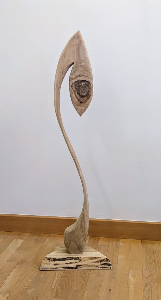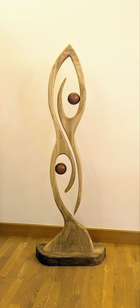 Die kleinere Skulptur ist aus Kastanie pur, die Größere ist eine Kombination aus Kastanie, Zwetschke und Nuss.